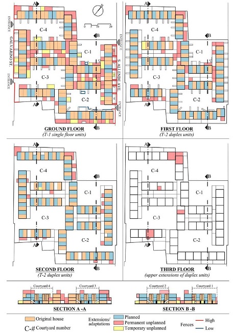 In twelve years, there have been substantial changes in the way how residents covered their housing needs which evidence progressive and ongoing housing extensions. The types of extensions built by the residents have been divided in planned and unplanned referring to whether Elemental considered them, or the residents built beyond the designer's plans for the expandable houses. An example of how Elemental’s design has dramatically changed is presented in Figure 4 which presents the changes in the built and open spaces showing the impacts of the unplanned extensions. Houses backyards were occupied in 30 of the 34 typology 1 houses, eight occupied part of the courtyards intended to serve as a common interaction space for the community, and four households facing streets also occupied the frontal space.