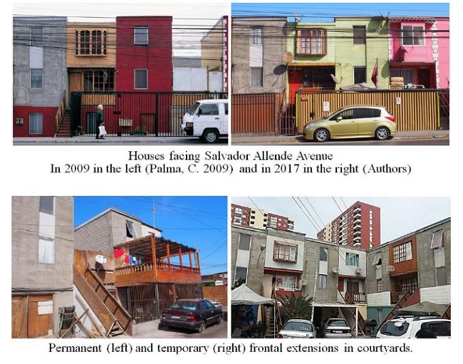 Fences are another way of appropriation of the space which is not roofed. Households facing streets decided to build high fences, mostly driven by safety reasons “the houses along the main avenues are more vulnerable, that is why they built fences” (Male, 49; Interview 10, Aug. 5, 2017). Residents facing S. Allende Ave. built fences of accessing each house and they were covered by plywood to block the view from the exterior (Figure 6). Houses facing Galvarino St. also have high fences, although they are shared between houses in the ground floor and upper housing units and views from outside are not blocked in most of the cases. Additionally, three houses in courtyard 2 built low fences to define the space they use as an extension of their homes or to define green spaces. Once residents constructed fences to define their extended space, it results easier for them to start making temporary extensions that would become permanent within these limits already established, one resident mentioned: “I would like to build the wall in front with concrete blocks and I want to make the concrete flooring” (Female, 84; Interview 7, Aug. 1, 2017).