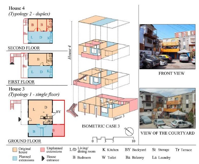 Presented in Figure 8, this is a group of two households from House 3 (typology 1 in the ground floor) and House 4 (duplex in the first and second floors) that are in courtyard 1 (Figure 1). The household of the House 3 is composed of seven people, the mother of the family, two sons, two grandsons and two granddaughters. The extended family decided to build two bedrooms in one-third of the house, which extended to the back occupying only one-third of the backyard. The family kept the original layout of the living and dining room, as well as the kitchen and bathroom. The family uses the frontal space as storage and terrace. This space is covered by the balcony of the upper floor.