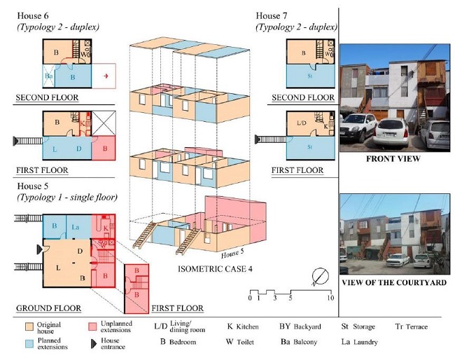Presented in Figure 9, this case a group of three housing units, House 5 typology 1 in the ground floor and Houses 6 and 7 which are typology 2 and located in courtyard 1 (Figure 1). The single parent family is led by a mature lady who lived with her three sons and three daughters and the grandmother moved in four years ago. The family extended the house to accommodate the family, giving more privacy to the grandmother whose bedroom is on the ground floor and next to the house entrance. A corner of the living room was slightly modified to serve as a sleeping space, while a bedroom was built in the backyard. The house owner effectively coordinated with the owner of House 7 to build two bedrooms on an upper floor due to the need for additional livable spaces. Later the family moved the kitchen and the bathroom to the backyard and build a staircase to access the upper bedrooms. Despite the lack of awareness of the decreasing living conditions resulting from covering all the backyard, the homeowner observed that this was the only option to accommodate the 8 members of the family. The homeowner expressed her initial disappointment because of the unfinished house she received, after extending she feels proud of her achievements. She also acknowledged the good quality of construction of the Quinta Monroy houses tested during the 2014 earthquake that hit Iquique.
