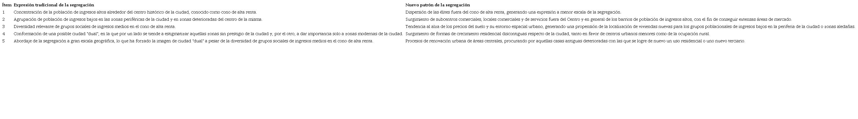Por lo anterior, la segregación residencial es un fenómeno que a través del tiempo ha presentado dos expresiones como se puede observar en la tabla 1. La primera se conoce como patrón tradicional de la segregación y fue desarrollada en gran parte del siglo XX, tiene como principales características la alta concentración espacial de los grupos socioeconómicos altos y con tendencia a expandirse en forma de cono hacia la primera periferia; localización de la población socioeconómicamente vulnerable en las zonas periféricas de las ciudades, las cuales se destacan por tener equipamientos colectivo precarios, como también ubicaciones en el centro deteriorado de la ciudad; posible diversidad social en los barrios con sujetos de condición socioeconómica alta; conformación de la ciudad dual; y estructura a gran escala2 de la segregación. La segunda es la nueva expresión de la segregación, desarrollada primordialmente con las reformas económicas y urbanas bajo el modelo de liberalización de los mercados del suelo (Sabatini y Cáceres, 2005), contrario al patrón anterior, el nuevo se caracteriza por tener una expresión de la segregación a pequeña escala geográfica; se rompe con la alta concentración de las élites; construcción de multicentrismo comerciales, de oficinas y de servicios; el alza generalizada de los precios del suelo y por ende su escasez; expansión residencial de los grupos de élite en la zona periférica de la ciudad en condominios o vivienda tipo campestre; y procesos de renovación urbana.