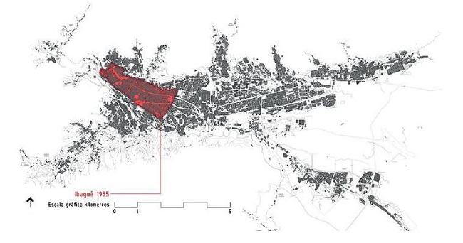 Ibagué en la primera etapa de la urbanización durante el periodo colonial contaba con el trazado en damero que empezaba en el centro en su plaza fundacional y que proyectaba a expandirse hacia la zona nororiental, pues en la zona noroccidental la montaña la rodea como límite físico al núcleo urbano (Figura 1). En la década de los cuarenta del siglo XX se gestó un crecimiento lineal desde la zona céntrica, que reconfiguró territorialmente a la ciudad en torno a las vías de interconexión nacional y regional para integrar a la ciudad a la economía del país bajo el proyecto de modernización liderado por los gobiernos liberales de la época, por lo tanto se dieron adecuaciones en la industria, principalmente del arroz, el algodón y el sorgo, interconexión que ha sido característica de la ciudad desde su fundación hasta el presente, porque ha cumplido con el papel de centro de enlace con otros municipios que se iban tejiendo en una red de carácter regional y de vinculación con Santafé de Bogotá (Rivera, 2016).