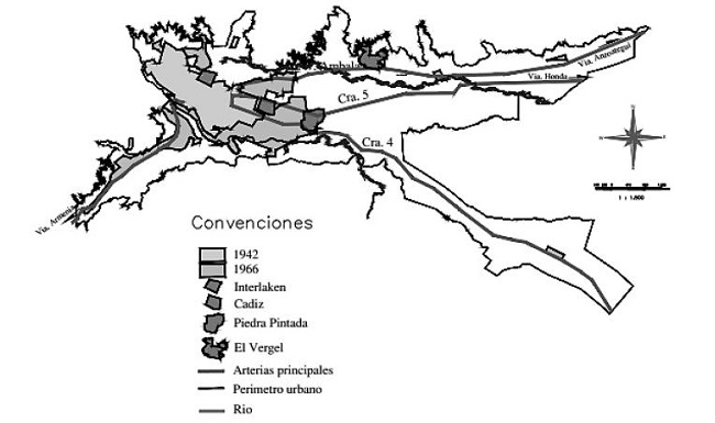 La situación de crecimiento de población generó un impacto espacial en la ciudad, expresado entre el tramo oriente y occidente; en las inmediaciones de los ejes viales de la carrera cuarta (Avenida Ferrocarril), quinta y la catorce (Avenida Ambalá), se encontraban barrios dispersos entre legales y no legales, y entre ellos lotes vacíos que para la época se denominaban lotes de engorde, morfología precedida por el clientelismo político del momento, interesado en las rentas urbanas. Un ejemplo de ello fue la construcción del barrio Belén (ver Figura 3), beneficiado por la construcción vial del centro -propuesta desde el Concejo Municipal- y de equipamientos como el Parque centenario y el Colegio Tolimense, contribuyendo a la valorización del suelo, mientras que hacia afuera se encontraban los barrios precarios (González, 2006).