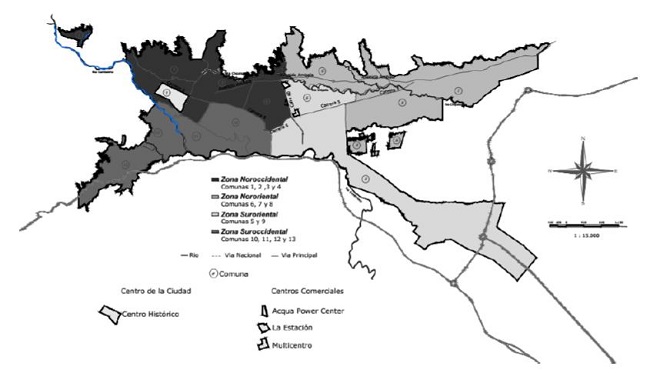 Por otro lado, a partir de la primera década del siglo XXI en el centro geográfico de la ciudad se construyeron centros comerciales (Multicentro, La Estación y Aqua Power Center) sobre la calle 60 (figura 7), conocida como la milla de oro por el boom inmobiliario comercial y de vivienda que se ha gestado en esa área y que pasó de ser estrato medio a estrato medio alto, lo que generó una nueva división espacial de cultura y de consumo; así, las actividades comerciales que se gestaban en el centro tradicional de la ciudad se descentralizaron y surgieron nuevos subcentros comerciales.