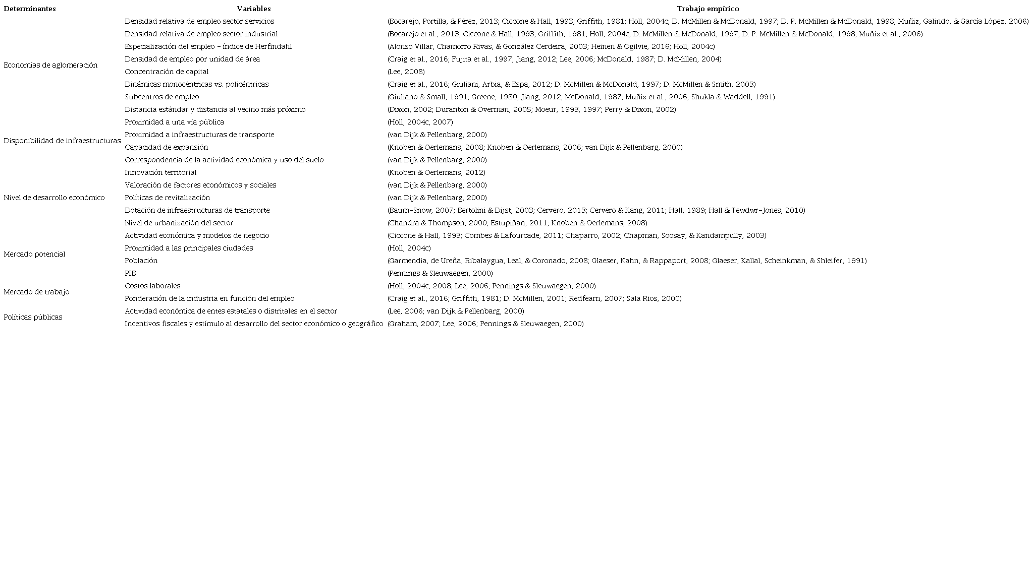 Inicialmente se resaltan los trabajos de Giuliano and Small (1991), Fujita et al. (1997), Fujita and Thisse (2003), Holl (2004b, 2004c, 2007, 2008, 2013), McMillen (2004), Litman (2017) o Cottineau et al. (2018) quienes utilizan metodologías para evaluar aspectos del territorio tales como la aglomeración evaluada por medio de la densidad de población, el acceso a mercados medido a través de un índice de potencial de mercado, el tamaño del mercado local, la diversificación de mano de obra, los costos locales y el ambiente económico, el acceso a sistemas de transporte urbano e intermunicipal, la disponibilidad de servicios a los productores y la existencia de autopistas interregionales.