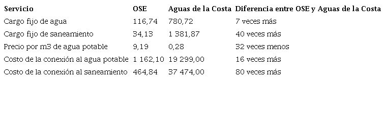 Según un entrevistado, la privatización produjo graves consecuencias sobre el sistema nacional de subsidios cruzados, al reducir en aproximadamente un tercio las contribuciones del departamento de Maldonado, uno de los departamentos con mayores tasas de ingresos per cápita, a la OSE. Esta última fue privada del superávit que financiaba inversiones en el resto del país, especialmente en zonas más pobres y menos densas. Los dos consorcios no reinvirtieron sus beneficios en el territorio nacional, consolidaron su capital o invirtieron en la mejora de los servicios del departamento para atraer capitales vinculados al desarrollo turístico. Para algunos entrevistados, la continuación de la privatización del servicio en Maldonado tuvo por ende una incidencia colateral en la tarifa de otras zonas del país: “Si no hubiese existido durante esos años la privatización del departamento de Maldonado, los aumentos tarifarios de la OSE en todo el país hubiesen sido considerablemente menores.”7