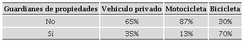 En este sentido, el 50% de los hijos de los guardianes de las propiedades son jóvenes que al iniciar una familia propia deciden buscar propiedades para cuidar, ya sea por conocimiento de este trabajo o por desconocimiento de otros trabajos; es más, consideran que es una forma de no pagar un alquiler, y, si corren con suerte, hasta un ingreso económico pueden recibir por su trabajo. El otro 20% son personas que no crecieron o vivieron en el fraccionamiento, y, por tanto, llegaron del exterior, pero que fueron recomendados por los guardianes originarios, ya que una de las características de los propietarios es encontrar personas de confianza a quien encargarles la propiedad. En cualquiera de los dos casos (guardianes de propiedades originarios y guardianes de propiedades recomendados), se presentan entropías en la accesibilidad a los servicios de transporte y consecuentemente al ejercicio cotidiano de la movilidad. Por ello, una de las interrogantes obligadas hizo referencia al medio que utilizan con mayor frecuencia para ejercer sus desplazamientos (Tabla 2). De aquí, se encontró que la mayoría realiza sus desplazamientos a pie y/o bicicleta; en tanto, quienes cuentan con vehículo privado lo utilizan en la medida de lo posible. Además, se puede inferir que las condiciones de accesibilidad en el fraccionamiento inducen a la movilidad motorizada individual en los trayectos largos, ya que el 35% de los encuestados posee un vehículo propio (Tabla 3).