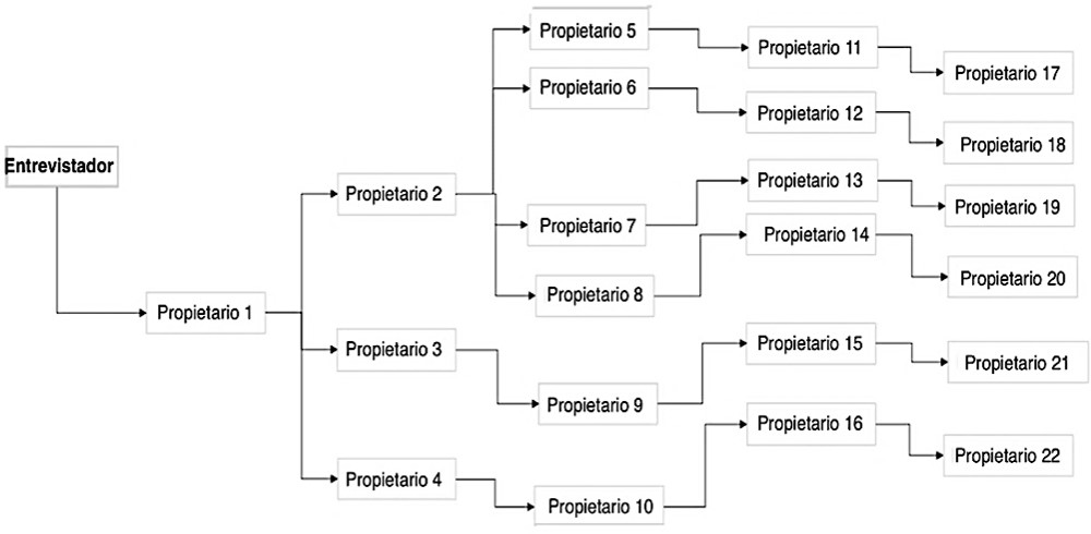 Las entrevistas siguieron la técnica cualitativa de la bola de nieve, donde un residente propietario sugería y proporcionaba datos de otro residente propietario. En este ejercicio se obtuvo información del origen del asentamiento y de las características y motivos de la compra de la propiedad; es decir, si la propiedad adquirida ya estaba construida, o se compró como lote que posteriormente fue edificándose. De igual forma, se obtuvo información de las condiciones de habitabilidad, contratación de los guardianes de las propiedades, entre otras características locales. El total de entrevistas aplicadas fue de 22. La elección del primer entrevistado no siguió ningún criterio en particular y la decisión fue meramente aleatoria; no obstante, el límite superior se determinó con base en la iteración de respuestas de los propietarios de las viviendas; es decir, a través de una aproximación sucesiva de las respuestas de los últimos entrevistados respecto a las respuestas de los penúltimos y antepenúltimos; en otros términos, el estudio concluyó cuando fueron identificadas homogeneidades en las respuestas (Figura 5).