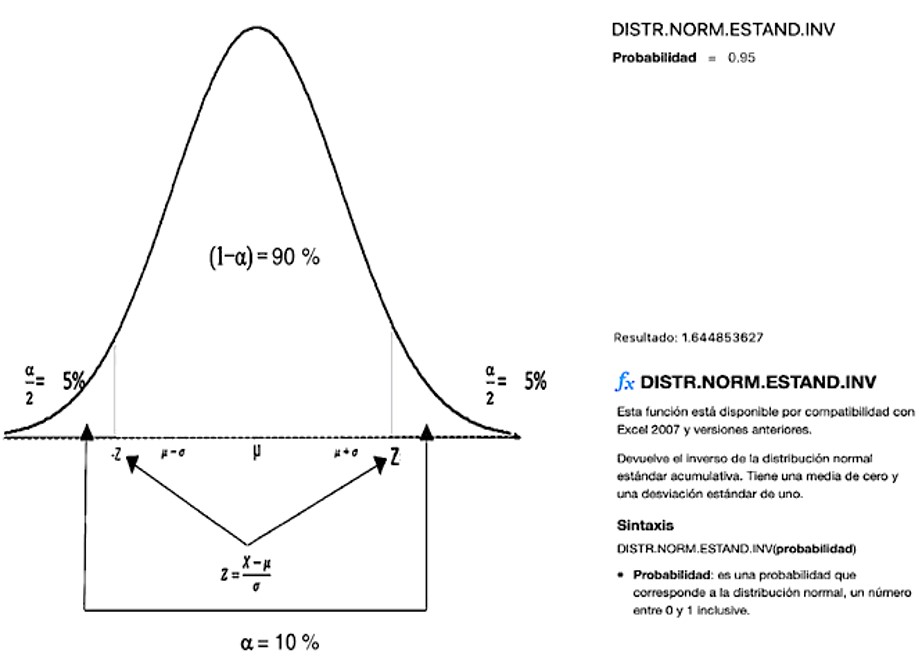 La utilización de la Ecuación (1) resume el hecho de que puede ser utilizada en estudios cualitativos, y, de acuerdo con Aguilar (2005, p. 336), López y Fachelli (2015, p. 25) y otros, la fórmula permite obtener una muestra representativa de la población. En efecto, entre mayor sea el nivel de confianza, mayor es el número de elementos seleccionados, y por tanto, mayor es la probabilidad de encontrar el valor verdadero en la muestra calculada (Aguilar, 2005, p. 335). De esta manera, se consideró el total de la población del fraccionamiento; es decir, 1117 personas con un nivel de confianza (1−α) = 90% y nivel de significancia α= 10%. De ahí, para este nivel de confianza se obtuvo un valor Z normal estándar aproximado de 1.645 (Figura 6).