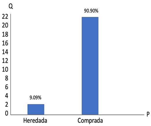 Se obtuvo que el 72.71% de los entrevistados tienen una antigüedad mayor a veinte años de haber adquirido la propiedad en el fraccionamiento, respecto a un 27.29% que tiene menos de ese parámetro (Figura 7). El 90.9% adquirió la propiedad por medio de la compra, cuyas causales de adquisición en esta periferia concentra el factor tranquilo; es decir, “porque el fraccionamiento se encuentra ubicado en la periferia de la ciudad” y eso es garantía de menor congestión del tráfico, ruido y contaminación ambiental. Sin embargo, otros residentes consideran que su adquisición se debió a factores familiares, “porque algunos de sus hermanos también tienen casa de campo en dicho lugar” y les han externado que es un buen lugar para vivir o descansar. Asimismo, un 9.09% expresó que “les heredaron” la propiedad, ya sea de sus padres o abuelos (Figura 8).