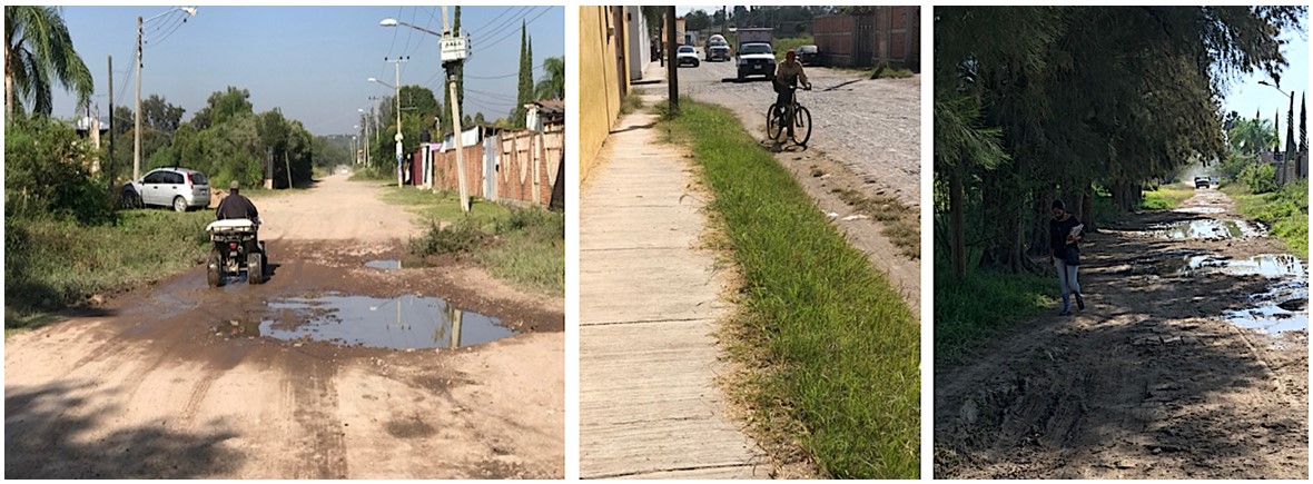En lo que concierne al fraccionamiento de Jardines de La Calera, se puede inferir que la proximidad en el acceso a los servicios básicos está determinada por la infraestructura y la disponibilidad de los medios de transporte que se cuentan en el fraccionamiento. En este sentido, los guardianes de estas propiedades ven complicada su movilidad, a tal grado que tienen que realizar largos desplazamientos diarios, que junto al abandono por parte de la autoridad municipal se suman al deterioro de la infraestructura viaria. Estas entropías no favorecen condiciones para la movilidad peatonal, en bicicleta, motocicleta, e incluso en vehículo privado, debido al mal estado de las vialidades.