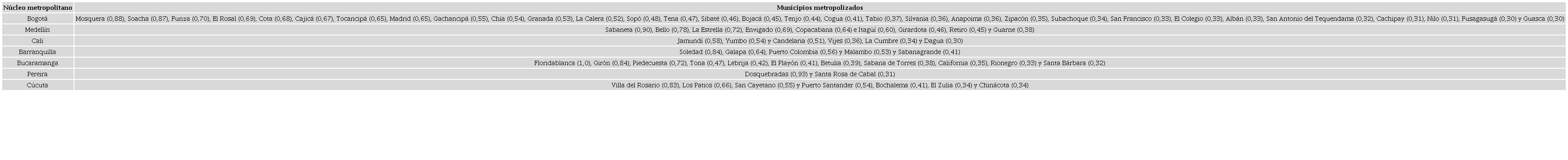 Con base en el modelo de la ecuación (4) y resueltas las deficiencias de la estadística poblacional con los ajustes de cobertura, se identificaron las relaciones de metropolización básicas y, de allí, las siete zonas metropolitanas de la Tabla 1 conformadas por los municipios con un índice Z superior a 0,30. Conjunto urbano propiamente dicho lo conforman Bucaramanga y Floridablanca, pero están próximos a tal umbral Pereira y Dosquebradas, Medellín y Sabaneta, Bogotá, Mosquera y Soacha, Barranquilla y Soledad y, por último, Cúcuta y Villa del Rosario. De conjunto, estas aglomeraciones humanas son las que se encuentran a la cabeza del sistema colombiano de ciudades.