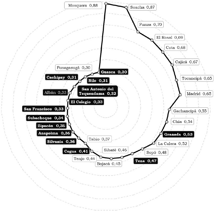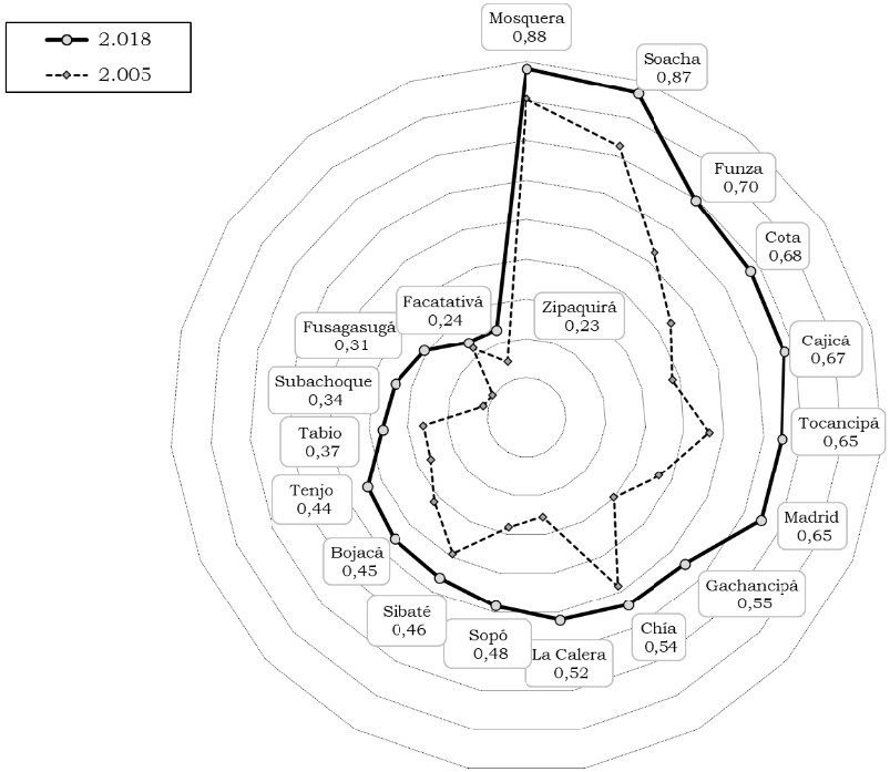 Zipaquirá está localizado hacia el norte a 50 km de Bogotá, Facatativá hacia el occidente a 52 km y Fusagasugá hacia el sur a 70 km. Hasta el 2005, estas jurisdicciones eran los referentes espaciales más lejanos de la zona metropolitana y, debido a ello, los índices de metropolización eran los más bajos -ver Figuras 1-. En el entorno metropolitano más próximo a Bogotá, Mosquera y Soacha han establecido las relaciones de metropolización más intensas. La figura radial interna corresponde al índice de 2005 y la exterior al de 2018, denotándose con ello la profundización de las relaciones de metropolización de Bogotá, consistente en el aumento del Índice de Metropolización, Z.