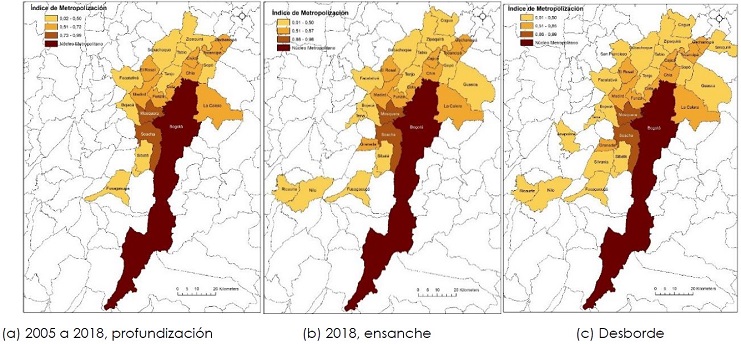 Incipientes relaciones de metropolización se detectaron entre Manizales y Villamaría, Armenia y Circasia y entre Cartagena y Turbaco. Las relaciones de metropolización de Bogotá se explayan más allá de su entorno inmediato y, al comparar su avance con relación al 2005, se encuentran diferencias espaciales que se captan en tres tipos de movimientos: profundización, ensanche y desborde.