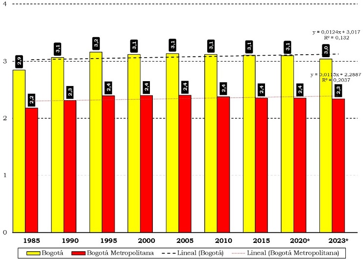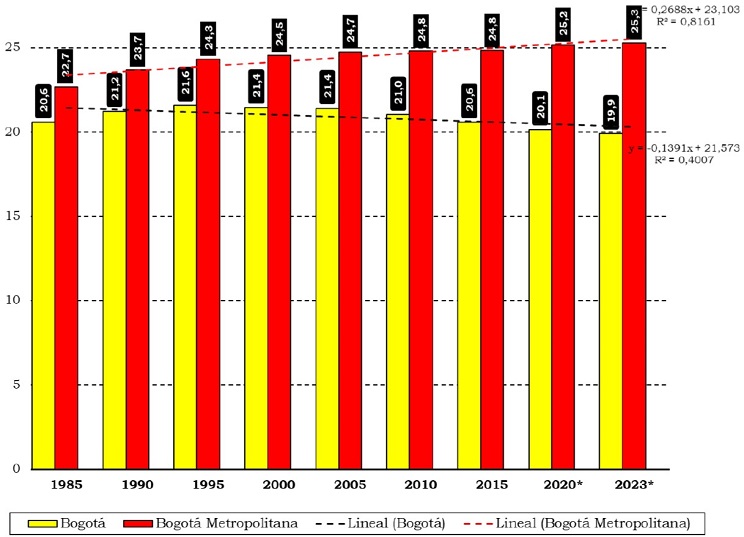 La tasa de crecimiento intercensal 2005-2018 osciló alrededor del 0,62% anual, y las proyecciones actuales del DANE parten de 2,40% en el 2019 y se ralentizan de manera acelerada hasta llegar al 0,84% en 2023. Esto se ratifica en los resultados municipales de las retroproyecciones del DANE (2020, p. 15), revisión a partir de la cual la tasa de crecimiento exponencial de Bogotá toca piso en el 2015 con una tasa próxima al 0,60% y asciende a ese 2,40% en 2018, iniciándose a partir de allí una nueva etapa de ralentización.