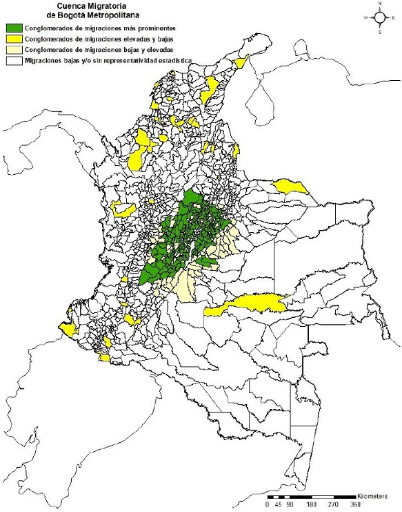 En la zona metropolitana de Bogotá residen personas originarias de todos los municipios del país. Sin embargo, el Índice de Moran del lugar de nacimiento de los residentes en Bogotá, Mosquera y Soacha indica que, con una elevada probabilidad que su patrón espacial no es aleatorio, y que existe un conglomerado de municipios de origen agrupados a valores muy altos -ver Figura 8- que hacen de la zona metropolitana la principal cuenca migratoria de Colombia, tendencia que como se ha afirmado conducirá a su consolidación como una megalópolis híbrida. En contraste con los conglomerados de municipios con migraciones más prominentes agrupados en la zona andina, los conglomerados de migraciones elevadas y bajas son los últimos vestigios de la volatilidad regional de las migraciones, acaecidas principalmente en el contexto de la agudización del conflicto interno armado.