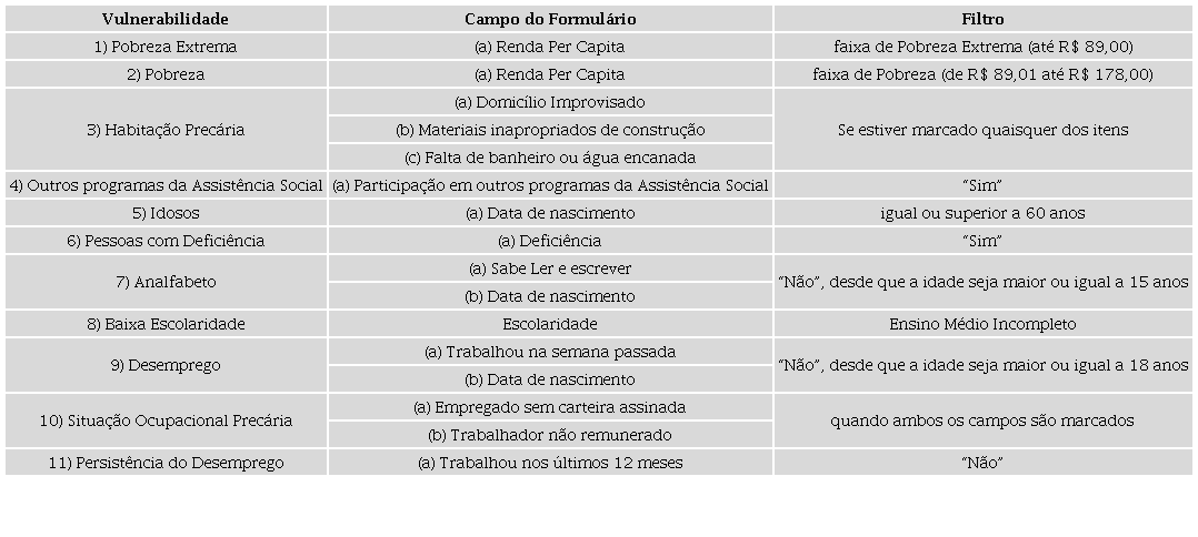 A caracterização das vulnerabilidades identificáveis no CadÚnico foi definida em reuniões realizadas com a equipe de Vigilância Socioassistencial da Semas. Como resultado dos debates realizados, após consultas da equipe de assistentes sociais, ficou acordado que, dentre as centenas de variáveis, as 11 vulnerabilidades listadas no Quadro 1 são as mais relevantes. Na última coluna são definidos os filtros de cada campo.