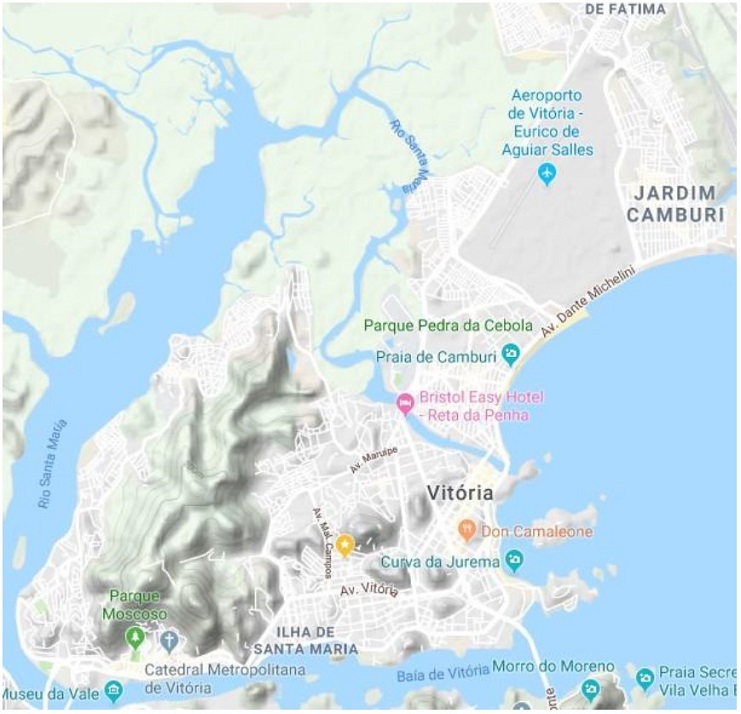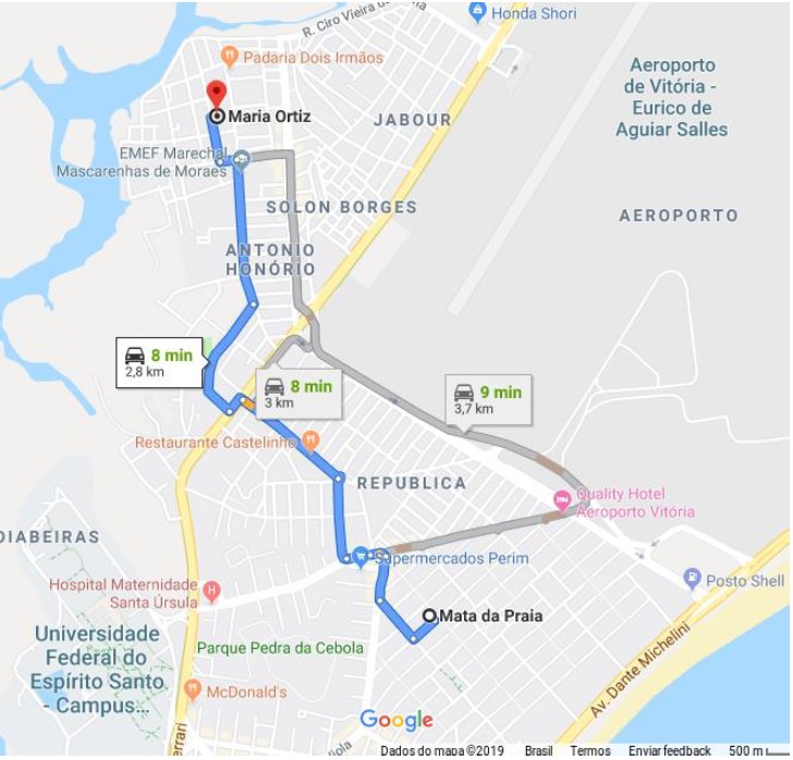 O município de estudo, Vitória, no Espírito Santo, apresenta IDHM de 0,845, a quarta posição dentre os municípios do Brasil (AtlasBR, 2021)1 e, em 2021, foi considerada a 2ª melhor capital para se viver no Brasil pelo Desafio da Gestão Municipal (DGM, 2021)2. Se a avaliação fosse baseada nos índices expostos, poder-se-ia supor incorretamente que toda a população se encontra num patamar de estabilidade financeira, mas na cidade existem aproximadamente 28 mil famílias beneficiárias do sistema de assistência social (MDS, 2019). A capital do Espírito Santo é hoje composta de 79 bairros com realidades sociais e econômicas particulares. Sua Prefeitura, através da Gerência de Planejamento e Gestão do Sistema Único de Assistência Social (Prefeitura de Vitória, 2018), é responsável pela emissão de informações e subsídios tanto para a análise de situações de vulnerabilidade quanto para a formulação de estratégias de enfrentamento destas. Para tal, utiliza os dados do CadÚnico. Pensando nisso e na necessidade de conhecer como a vulnerabilidade se faz presente, aliamos essa base de dados da prefeitura com tecnologias de geoprocessamento para melhorar o planejamento urbano. No caso específico da capital capixaba, a avaliação por bairro se mostra importante, pois numa distância de apenas poucos quilômetros estas unidades podem apresentar características sociais bem diferentes, como mostrado na Figura 1. Um exemplo é o bairro Mata da Praia (IDHM de 0,961), de classe média alta e o bairro Maria Ortiz (IDHM de 0,761), de classe baixa, com distância em torno de 3km, conforme mapa da Figura 2 que apresenta 3 diferentes rotas com 2,8 km, 3km e 3,7 km de distância.