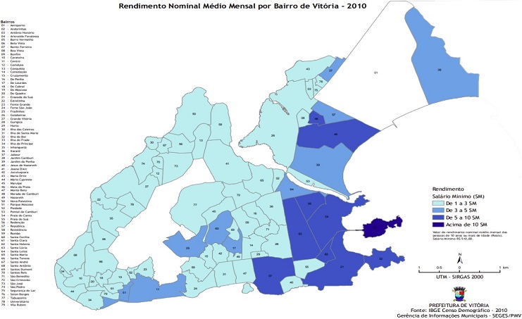 O município de Vitória é a capital do estado do Espírito Santo, na Região Sudeste do país. Com uma população de 369 mil habitantes, segundo estimativas de 2021 do Instituto Brasileiro de Geografia e Estatística (IBGE, 2021)3, a cidade é a quarta mais populosa do estado. Vitória é cercada pela Baía de Vitória e é uma ilha de tipo fluviomarinho e uma porção continental também fazem parte do município, perfazendo um total de 93,381km2. Serão utilizadas as nomenclaturas oficiais dos 79 bairros para o agrupamento das informações (Prefeitura de Vitória, 2003; 2006). A Figura 3 apresenta o mapa do município dividido por bairro e seu rendimento nominal médio mensal por bairro, de acordo com os dados do IBGE de 2010 (Prefeitura de Vitória, 2018).