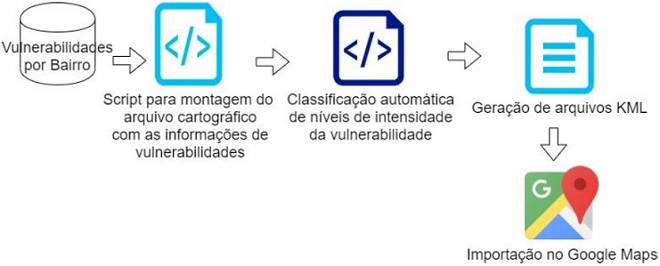 Posteriormente, fizemos a classificação do nível. O número máximo de cada vulnerabilidade de cada importação é armazenado, e é utilizado como parâmetro para o cálculo do nível que varia entre 0% e 100% da quantidade para o bairro. São 5 níveis, 0%-20%, 20%-40%, 40%-60%, 60%-80% e 80%-100%. Neste caso, a ideia principal, é apresentar a intensidade de cada vulnerabilidade por bairro (por tons de cores diferentes) em relação a mesma vulnerabilidade encontrada nos outros bairros, guardadas as proporcionalidades. Todas as informações estão em arquivos cartográficos no formato KML (Keyhole Markup Language). Optamos pelo site Google Maps5, por ser de uso gratuito e simples de ser usado. Para carregar o arquivo KML basta abrir o site do Google Maps e clicar em “Importar”. O fluxo para geração dos arquivos cartográficos para importação na ferramenta de mapas do Google encontra-se na Figura 7.