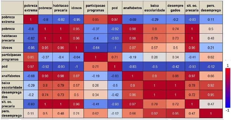 Na Figura 8 apresentamos a matriz do índice de correlação de Pearson (Lima et al., 2017) entre as vulnerabilidades a serem analisadas em nossa pesquisa. As cores ajudam a visualizar melhor as que têm um índice significante. Quanto mais intenso é o vermelho, maior é o índice de correlação positiva. Quanto mais intenso é o azul, maior o índice de correlação negativa. A vulnerabilidade “pobreza” e a “pobreza extrema” serem inversamente correlacionados se deve ao fato de se tratar de classificações disjuntas. Analisando a matriz, é possível perceber que a correlação positiva é dominante para uma boa parte das vulnerabilidades. Podemos destacar que, por exemplo, o número de pessoas analfabetas acompanha várias vulnerabilidades, como por exemplo: pobreza, habitação precária, baixa escolaridade, desemprego e situação ocupacional precária. E que esta população está avançando na idade, na categoria de “idosos”. Já as pessoas com deficiência se mostram inversamente correlacionadas com a pobreza, analfabetismo e idosos, mas altamente correlacionado com a pobreza extrema e participação de programas. Contudo, é de se estranhar que não esteja correlacionado com a habitação precária.