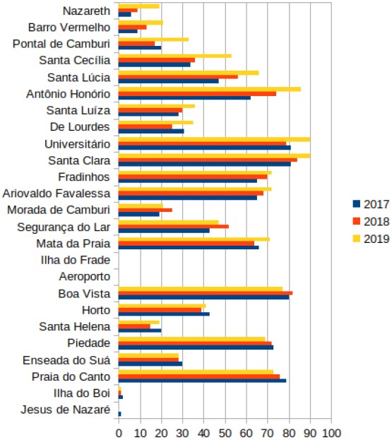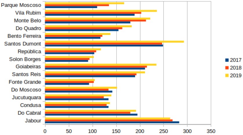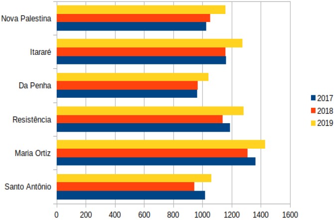 A evolução do número de famílias cadastradas por bairro por ano foi dividida em 4 grupos: bairros com uma quantidade de famílias maior que 900 (Figura 9), bairros com uma quantidade de famílias entre 300 e 900 (Figura 11), bairros com uma quantidade de famílias entre 100 e 300 (Figura 12) e bairros com menos de 100 famílias (Figura 14). Em todos os gráficos, a ordenação dos bairros (de baixo para cima) foi pela diferença percentual da quantidade entre 2019 e 2017 de forma crescente. Por exemplo, no gráfico da Figura 9, o bairro Santo Antônio (Figura 10) teve o menor aumento (4,3%) e o bairro Nova Palestina o maior aumento percentual (12,76%). Os 6 (seis) bairros que têm a maior quantidade de famílias cadastradas passam de 900 famílias em qualquer dos três anos são: Nova Palestina, Itararé, Da Penha, Resistência, Maria Ortiz e Santo Antônio. Apenas estes seis bairros, em 2019, somam 7.243 famílias cadastradas, em 2017 eram 6.719 famílias, apresentando um aumento geral de 7,80%.