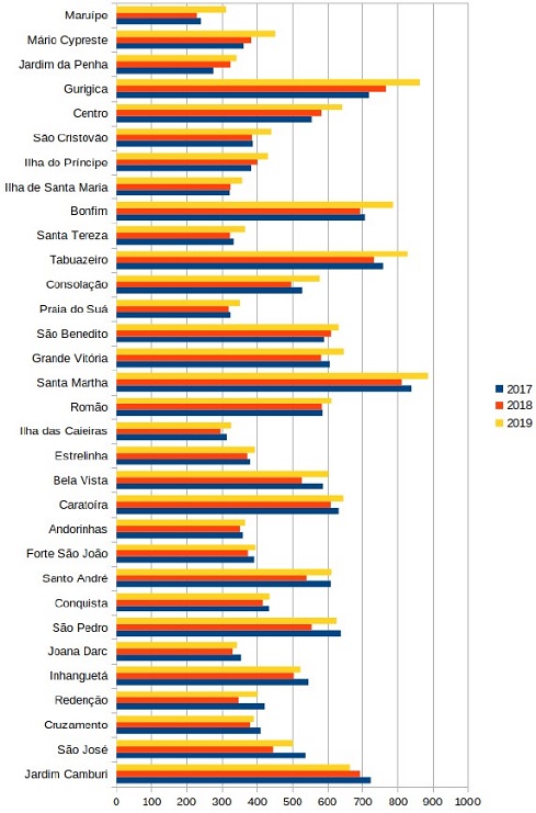 Há 32 bairros que têm entre 300 e 900 famílias cadastradas no CadÚnico (Figura 11). A soma de famílias é de 16.770 famílias em 2019, em 2017 eram 15.873, apresentando um aumento geral de 5,6%. Os bairros que apresentaram maior aumento percentual foram: Maruípe (30%), Mário Cypreste (24,79%), Jardim da Penha (23,1%), Gurigica (19,89%) e Centro (15,65%). Bairros que apresentaram as maiores diminuições da quantidade de famílias foram: Jardim Camburi (-8,29%), São José (-6,86%), Cruzamento (-4,63%), Redenção (4,51%) e Inhanguetá (4,02%).