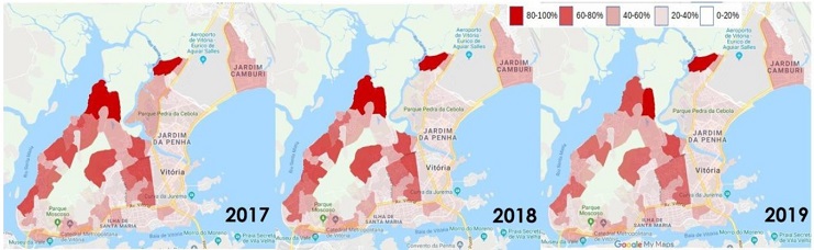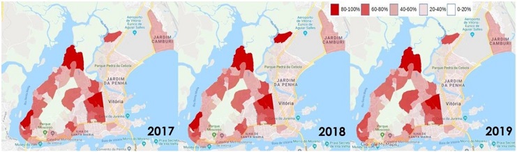 O mapa da Figura 19 apresenta a vulnerabilidade de Habitação Precária. Foram considerados os itens no cadastro marcados como falta de água encanada, material de piso ou parede precário, domicílio improvisado, condições dos banheiros e falta de coleta de lixo. As maiores mudanças foram: melhoria do Bairro da Penha que estava como situação nível máximo em 2017 e não mais em 2018 e 2019; a piora do bairro Centro que não estava no nível máximo em 2017, mas que chegou ao nível máximo em 2018 e 2019; e uma redução significativa do nível em Jardim Camburi.