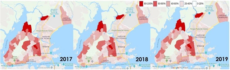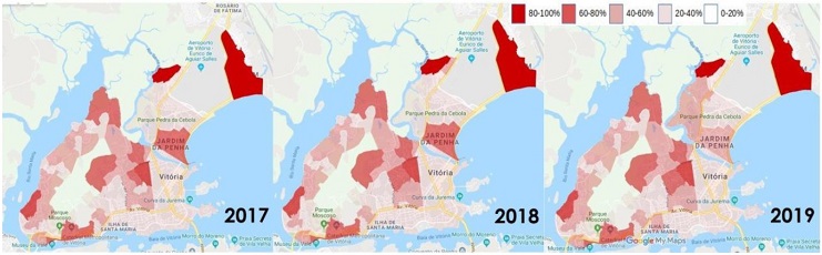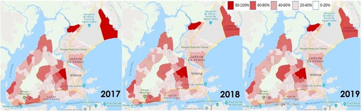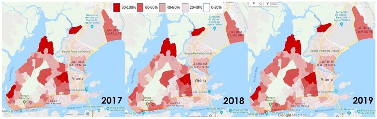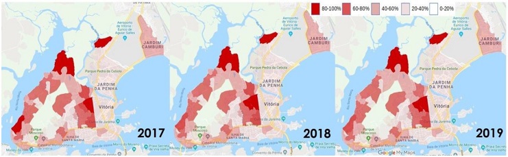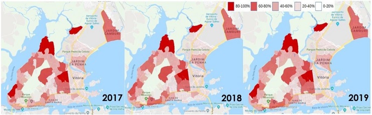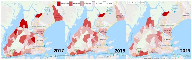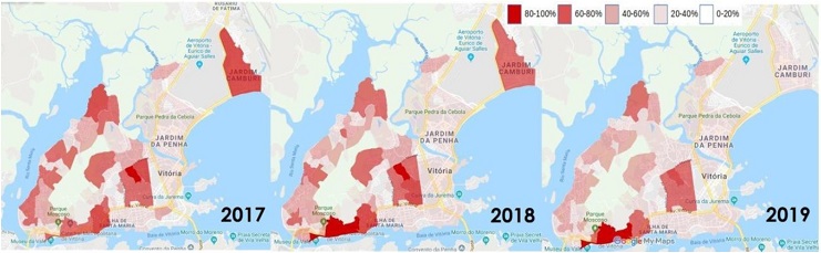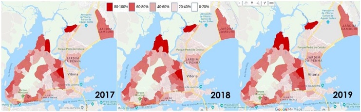 Abstract: Knowing the vulnerabilities of a city is fundamental for the State’s actions of social protection. In the city of Vitória-ES, the neighborhoods can be very different in a short distance, so in this study we seek to analyze the profile of the population at social risk, through vulnerability maps identified in the Cadastro Único, grouped by neighborhood. We processed the CadÚnico de Vitória database between 2017 and 2019. We continued to extract and cross-reference this data with cartographic information to identify priority situations for social assistance. We assessed 11 vulnerabilities: Extreme Poverty, Poverty, Precarious Housing, Participation in other Social Assistance programs, Elderly, People with Disabilities, Illiterate, Low Education, Unemployment, Precarious Occupational Situation and Persistent Unemployment. Finally, via GoogleMaps we generate maps that present an intensity rating of each vulnerability by transparency and color overlaid on a layer of polygons delimiting the neighborhoods. The results show that each neighborhood has a different pattern of vulnerabilities, and their mapping indicates unique characteristics that can help municipal management in a more specific planning.