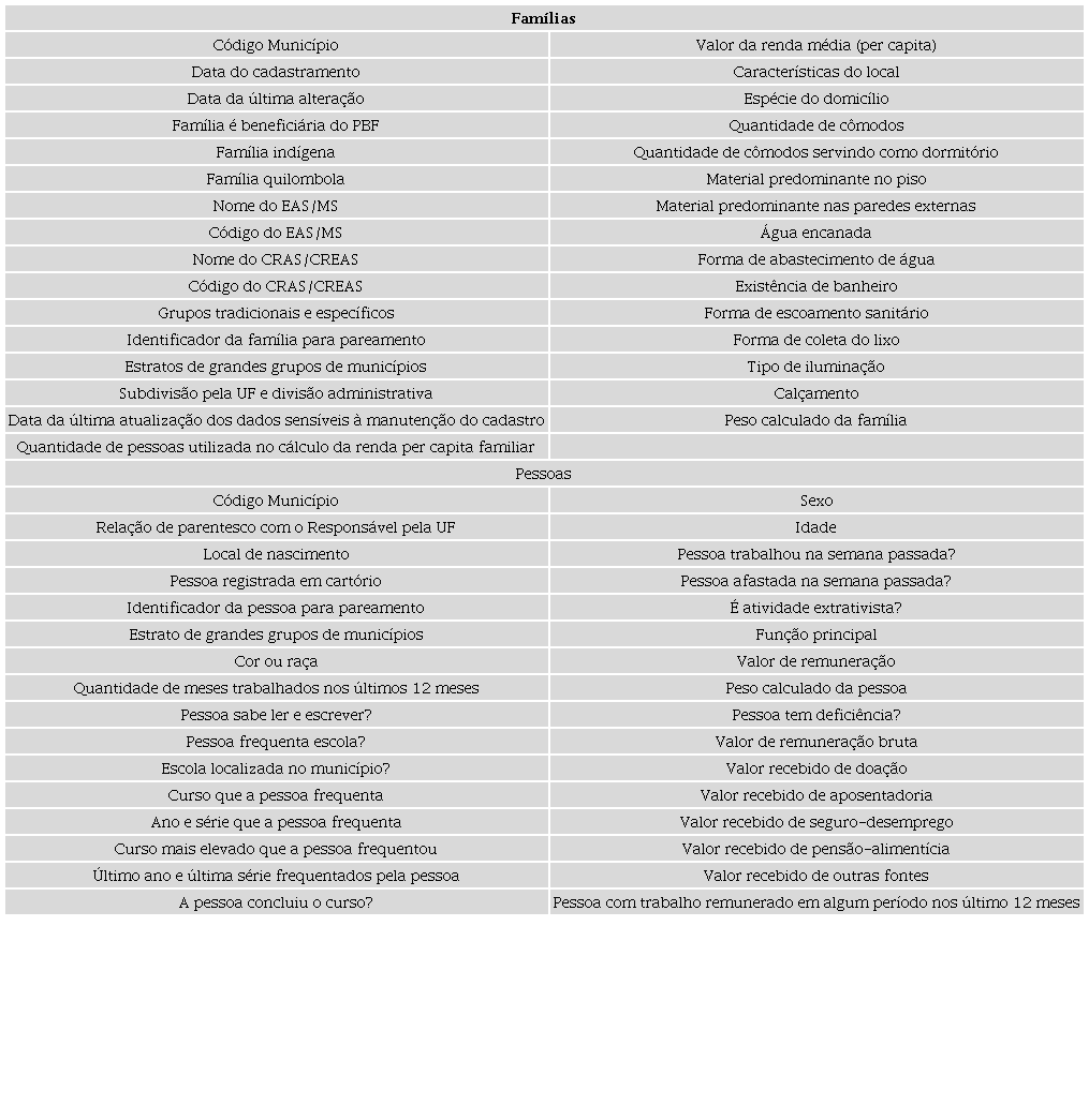 Ao todo, como listadas na Tabela 1, são disponibilizadas 30 variáveis referentes a famílias e 34 variáveis referentes a pessoas: