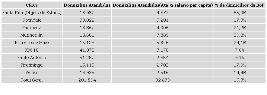 Além do CRAS Santa Rita, objeto deste estudo, Osasco conta com outros 8 centros responsáveis por toda extensão do município como mostra a Tabela 2: