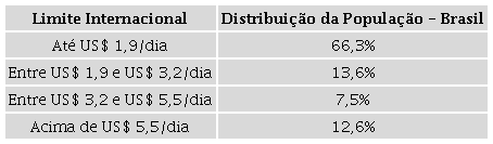 O valor referência de US$ 1,9/dia utilizado para classificar a situação de linha de pobreza é uma quantia média do mínimo necessário para as necessidades básicas tomadas como parâmetro os países mais pobres. Para contornar as variações entre países, o Banco Mundial criou mais duas medidas para classificar a pobreza, incorporando os níveis de US$ 3,2/dia e US$ 5,5/dia para capturar a realidade da população que vive tanto em um país típico de renda média-baixa, quanto em um país típico de renda média alta (World Bank, 2020). Considerando que a população mundial em 2017 era de 7,6 bilhões de pessoas (UN-DESA, 2017) somente aqueles que viviam com até US$ 5,5/dia corresponderia a um mercado de mais de 3,3 bilhões de pessoas.