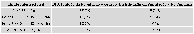 Ao se analisar o contexto da cidade de Osasco e da região atendida pelo CRAS Santa Rita (Tabela 4), verificou-se números semelhantes ao do contexto nacional, com a maior parte da população abaixo da linha de pobreza, sobrevivendo com até US$ 1,9/dia (53,7% e 57,1%).
