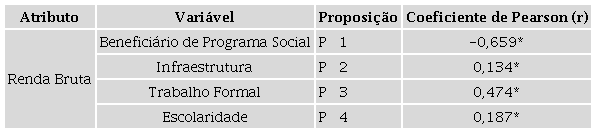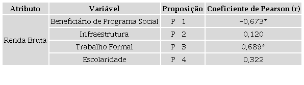 Para a discussão das proposições , , e foi calculada a correlação entre as variáveis em questão e a renda por meio do coeficiente de Pearson, utilizando os dados nacionais, conforme exibido na Tabela 5.