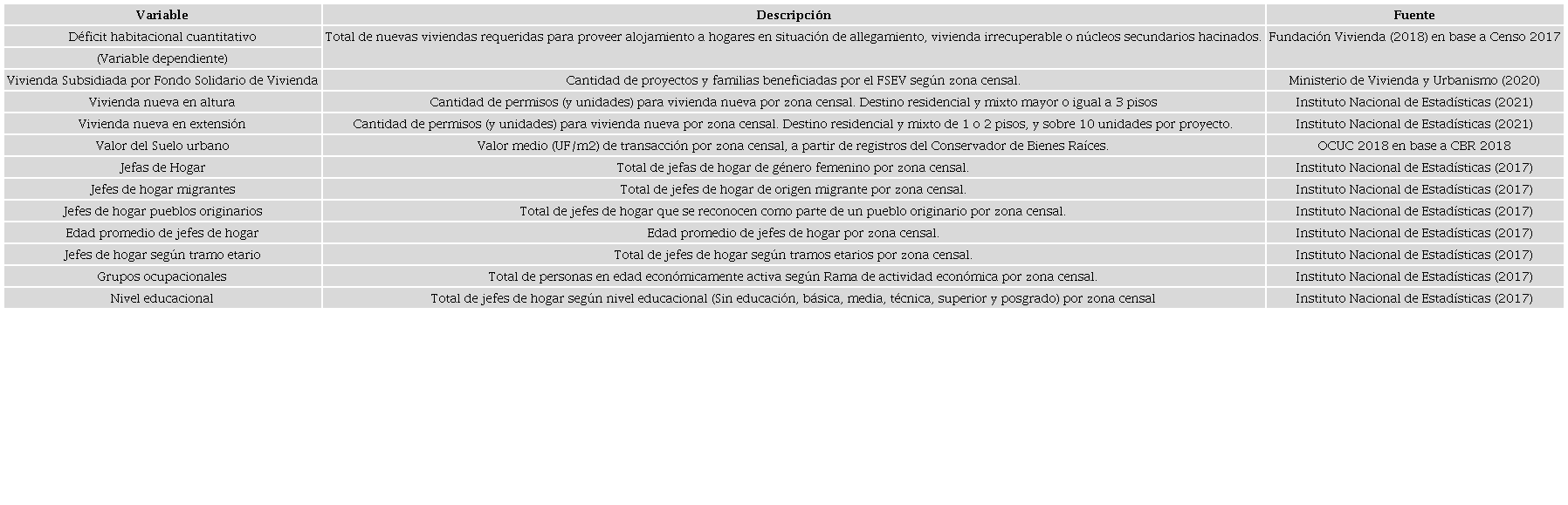 Un primer abordaje de esta propuesta metodológica correspondió a la recolección de diversos datos de origen público, como las estimaciones del déficit habitacional cuantitativo, la producción de nuevas viviendas (ya sea por actores privados o el Estado), valor del suelo urbano (a partir de registros oficiales de transacciones) y diversas variables sociodemográficas extraídas a partir del Censo 2017, los cuales se encuentran detallados en la Tabla 1.