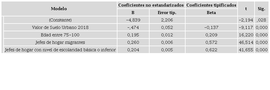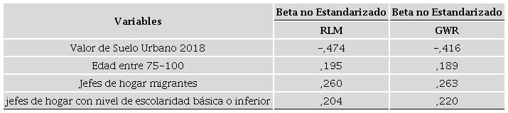 Como se observa en la tabla 5, las variaciones de los Betas de ambas regresiones son acotadas, lo que da cuenta de la consistencia de ambos modelos. Para el caso de la regresión geográficamente ponderada, se le quita un poco el peso a las variables de precio del suelo y al grupo etario de 75 a 100 años, en beneficio de las variables de jefes de hogares migrantes y porcentaje de jefes de hogar con enseñanza básica, lo que se explica por un comportamiento de distribución espacial aleatorio a nivel global (Índice de Moran cercano a cero), pero con auto colinealidad local moderada, que logra relevar de mejor forma el modelo espacial.