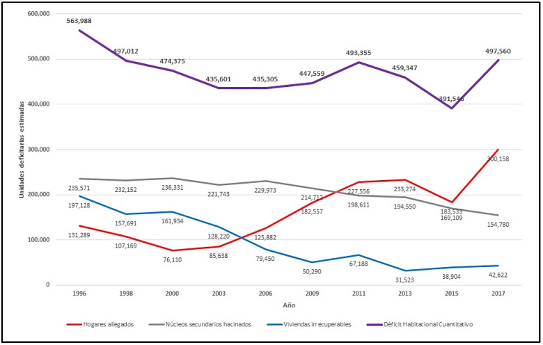Dicho problema, se entrelaza con otro conflicto relacionado a los efectos ambientales y sociales del crecimiento desregulado del mercado inmobiliario, abarcando desde la pérdida de suelo por crecimiento extendido (Hidalgo, Volker, & Ramírez, 2014; Silva-Lovera, 2015) como también la segmentación de los barrios debido a la alta heterogeneidad morfológica, en zonas de alta densificación residencial (Vicuña 2017). La consagración y priorización del derecho de propiedad por sobre el bien común es uno de los conflictos de mayor contingencia, dado el actual escenario constitucional que enfrenta Chile (Peralta Fierro & Yáñez Morales, 2019; Tapia 2020). El pujante desarrollo del mercado inmobiliario en Chile se contradice con el creciente déficit habitacional cuantitativo, el cual según cifras de la última encuesta CASEN 2017 se encumbra por sobre las 497.000 familias (figura 1), de las cuales más de un 55% viven en la Región Metropolitana (MIDESO, 2018).