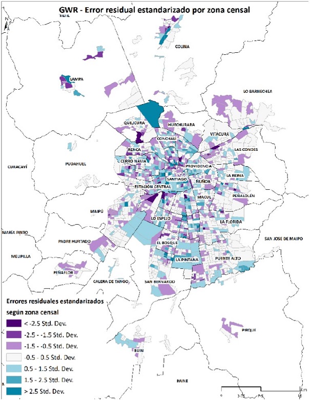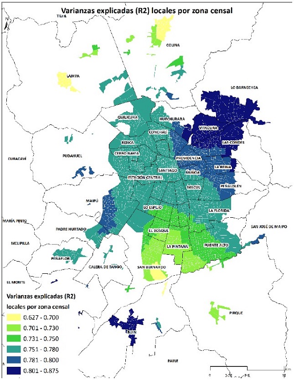 Lo anterior también se corrobora al observar el mapa que da cuenta de los R2 locales (figura 4). Una de las principales ventajas de la metodología GWR es que genera tantas ecuaciones como unidades espaciales existen, entregando para cada una un R2 diferente con sus respectivos factores beta espacialmente únicos para cada variable independiente. En este caso se aprecia que las varianzas explicadas más bajas (menores a 70%) se encuentran en las zonas más periféricas de la ciudad, correspondiente a las comunas de Colina y Lampa, lo que se explica principalmente por una menor cantidad de unidades espaciales de análisis para los modelos de regresión local, situación similar a lo que sucede con las localizaciones periféricas en un proceso de interpolación.