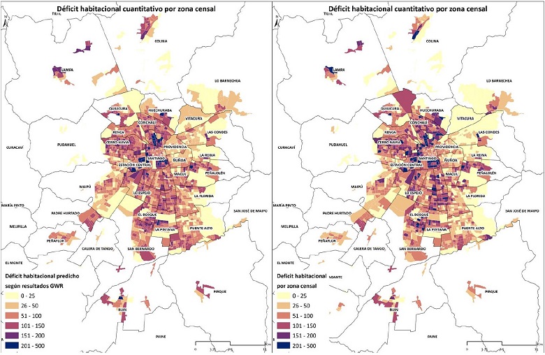 El caso contrario – correspondiente a estimaciones más altas que el observado, correspondientes a la zona poniente de Las Condes y Vitacura, donde ocurre lo contrario al caso anteriormente mencionado de Providencia, donde todas las variables presentan niveles de significancia muy altos, con muy baja cantidad de población sobre 75 años, pero con condiciones de vulnerabilidad nulas. Un segundo caso corresponde a la localización de barrios vulnerables de vivienda social, en este caso Bajos de Mena (Puente Alto) y Villa Esperanza (Maipú), se da principalmente por una conjugación de las variables de escolaridad y bajos precios de suelo, lo cual podría estar induciendo a una sobreestimación del déficit habitacional en dichos sectores.