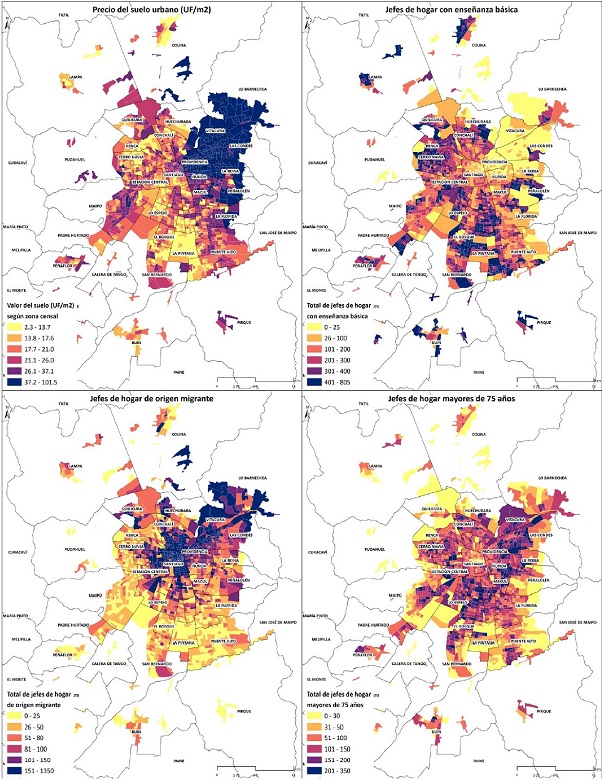 También es importante destacar la presencia de este tipo de hogares en localizaciones consideradas habitualmente como zonas no vulnerables socioeconómicamente, pero que con el pasar de los años se han ido deteriorando (Santiago oriente, Providencia poniente) enmascarando la situación de pobreza de hogares con jefes de hogares de la tercera edad que reciben jubilaciones precarias en en entornos con baja accesibilidad a bienes públicos urbanos.