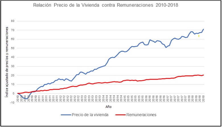 Los ingresos, sin duda, se constituyen como una de las principales barreras de acceso a la vivienda en el mercado chileno. Esto se refleja en la creciente brecha entre el índice de remuneraciones y el índice del precio de la vivienda que se presenta en la figura 6 (Vergara-Perucich et al. 2020) la cual ha contribuido a agudizar la crisis del acceso a la vivienda (Vergara-Perucich, et al., 2020) que se ha traducido en un significativo aumento del déficit habitacional entre 2010 y 2017, alcanzando niveles similares a los registrados durante fines de la década de los 90 (Urrutia, Correa, & Alt 2020).
