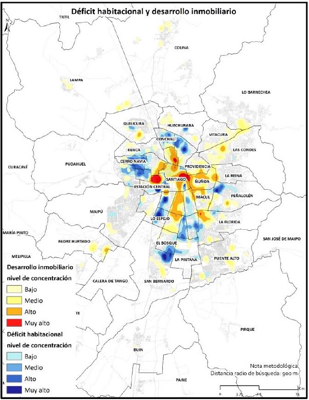El mapa anterior representa la dinámica espacial entre la oferta y demanda de la vivienda, la cuales son “como el agua y el aceite”. Pues observamos que los permisos de edificación se concentran en los sectores céntricos de la ciudad o siguiendo ciertos ejes claves del transporte público (como las comunas de San Miguel o Ñuñoa), mientras que el déficit se concentra en las comunas de la periferia de la ciudad, existiendo pocos espacios donde ambos fenómenos se traslapan. Esta gran producción de vivienda en altura es un reflejo del fuerte desequilibrio entre actores públicos y privados, donde un grupo defiende sus intereses apuntando hacia el desarrollo financiero y comercial, a través de la producción de nuevas unidades de vivienda, los cuales muchas veces han surgido aprovechando la escasa o difusa regulación normativa, reflejada en instrumentos de planificación que no alcanzan a ser actualizados al contexto urbano, por lo tanto, su obsolescencia es vista como un factor para la maximización de las utilidades de dichos proyectos inmobiliarios (Vergara-Perucich et al., 2020).