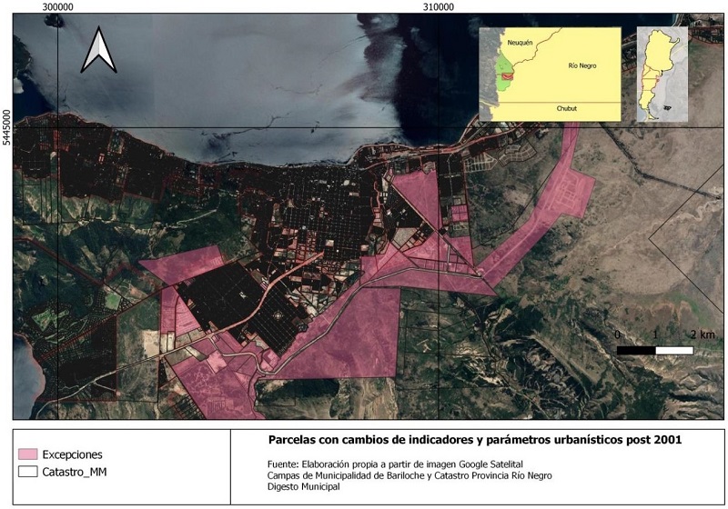 Según ( Medina, 2016), esta duplicidad ha sido funcional a la aplicación discrecional de las normas, favoreció los intereses del sector inmobiliario y perjudicó las posibilidades de acceso al suelo urbano por parte de la población local. Como contracara, durante esos años, se multiplicaron procesos de autoproducción del hábitat en diferentes barrios de la ciudad como Villa Llanquihue, Virgen Misionera, Don Bosco (en el oeste), Matadero, INTA, Valle Gas, San Cayetanito (en el centro y este) y Vivero, Nuestras Malvinas, Frutillar (en el sur) ( Guevara et al., 2018). No obstante, también se pueden señalar algunos loteos y fraccionamientos orientados a sectores medios acomodados que fueron, como el caso de Las Victorias hacia el este del ejido. Asimismo, en un proceso de conurbación incipiente, desde la década de 1990 se produjo un crecimiento explosivo de la vecina localidad de Dina Huapi, en el Departamento de Pilcaniyeu, que surgió como una “ciudad dormitorio” anexa a Bariloche.