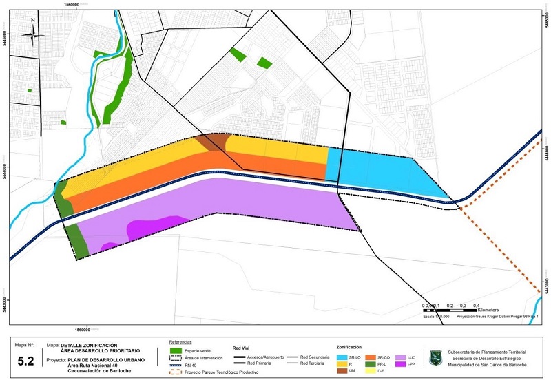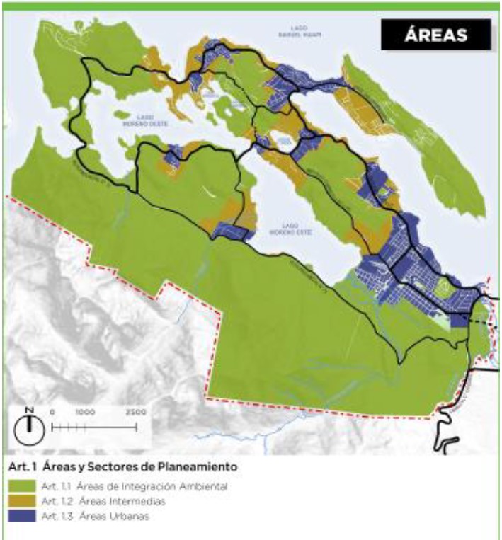 Primero, la Ordenanza 2540-CM-2014 aprobó el Plan de Desarrollo Urbano Área Ruta Nacional Nº 40, tramo Circunvalación de Bariloche ( Figura 4), que también venía a responder con una manda constitucional de 2007 que entre sus disposiciones transitorias suspendía los loteos y edificaciones a trescientos metros de cada lado de dicha ruta. Si bien existían planteos urbanísticos aprobados en algunas de estas áreas o en proceso de aprobación, quedaron frenados por la COM a la esperan de la formulación del plan. Este plan delimitó áreas de desarrollo prioritario (164 hectáreas), desarrollo concertado (303 hectáreas) y desarrollo condicionado (315 hectáreas), totalizando alrededor de 880 hectáreas que pasan a ser zonificadas como urbanizables.