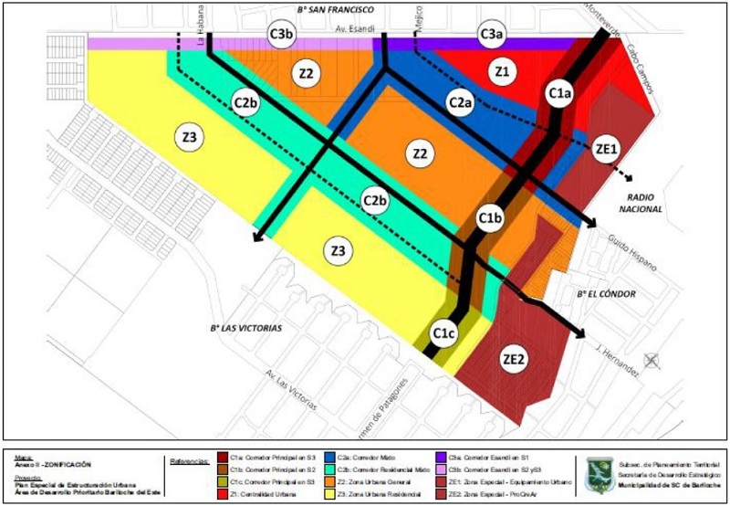 Segundo, la Ordenanza 2674-CM-2015 aprobó un Plan Especial para el Área de Desarrollo Prioritario Bariloche del Este ( Figura 5), conformado por 132 hectáreas ubicadas al este de la ciudad, entre la avenida Esandi, la avenida Circunvalación, la avenida 237 y el barrio Las Victorias. En este caso, es un área que había sido definida como “suelo urbanizable” por el POT, pero que se haya rodeada por “suelo urbanizado” lo que favorece su urbanización y consolidación. Los cálculos de ocupación progresiva del área estiman una población máxima de 33.400 habitantes: 3.200 habitantes al finalizar la primera década en 2025, 11.400 habitantes al finalizar la segunda en 2035 y 29.000 habitantes al finalizar la tercera en 2045. Como vemos, era un área que se preveía pudiera absorber buena parte del crecimiento urbano de los próximos años, pero que al día de la fecha se haya en un estadio de desarrollo incipiente.