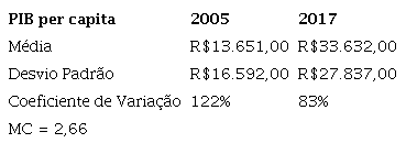 No processo de convergência do PIB per capita total das cidades médias, observou-se uma redução das disparidades de crescimento econômico no comparativo entre 2005 e 2017. No período, o resultado do coeficiente de variação reduziu 31,97%, confirmando a hipótese de convergência de PIB per capita entre as cidades médias brasileiras. Os achados sinalizam que, ao longo do tempo, as cidades médias apresentaram uma redução da distância entre seus níveis de crescimento econômico, com média de 2,66 ( Tabela 1).