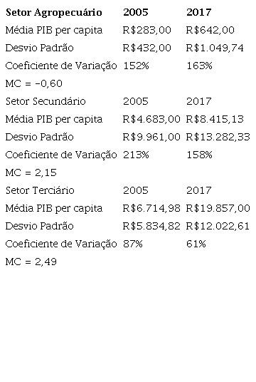 Analisando setorialmente o PIB per capita observou-se uma maior convergência nos resultados para os setores terciário (2,49) e secundário (2,15), demonstrando que o efeito verificado para o PIB per capita foi claramente estimulada pelas atividades de transformação, comércio e prestação de serviços, que apresentaram as maiores médias ( Tabela 2).
