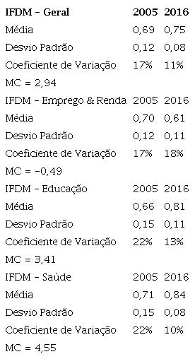 Observando as dimensões que compõem o IFDM geral, as maiores médias de convergência foram das dimensões saúde (4,55) e educação (3,41), que apresentaram as maiores reduções da dispersão em relação à média. O coeficiente de variação do IFDM-Saúde, de 2005 demonstrou que os desvios atingiram, em relação à média, 22% do seu valor. Já em 2016, o coeficiente de variação demonstrou que os desvios atingiram, em relação à média, 10% do seu valor. O que correspondeu a uma redução de 54,54% do coeficiente de variação. Consequentemente, como na Educação, 2016 foi o ano de menor avanço na última década (1,6%).
