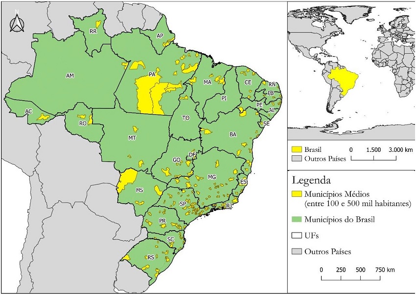 Frente ao exposto, o procedimento metodológico utilizou dois elementos: o primeiro foi o conceito das cidades médias, qual seja: centros urbanos com população entre 100 e 500 mil habitantes. Cabe justificar essa escolha a partir de dois prismas: o primeiro, a população das cidades passa por um notável processo de redistribuição espacial, no qual as cidades médias cumprem um papel decisivo, o que as tornam um importante objeto de estudo, pois podem ser valorizadas pela oferta de emprego, pela existência de infraestrutura básica, pelas oportunidades de acesso à informação e pelos melhores recursos educacionais, ou seja, pela existência de bens e serviços essenciais ao desenvolvimento humano ( Amorim Filho & Serra, 2001). O segundo é o aspecto demográfico populacional, ou seja, apesar da discussão sobre a dimensão do conceito cidade média, o foco no quantum populacional foi a tônica nesse estudo pela facilidade em operacionalizar o aspecto quantitativo e poder selecionar e classificar com mais clareza o objeto de estudo. O estudo clássico de Andrade & Lodder (1979) já reforçava a qualificação das cidades médias a partir do contingente populacional. Recentemente, Ferretto (2020) também acrescentou na classificação das cidades médias as suas funções de polarização, que geralmente os centros urbanos entre 100 e 500 mil habitantes exercem ao ofertar bens e serviços diversificados nas suas áreas de influência.