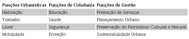 Esses núcleos de pesquisas caraterísticos pelas dimensões, sociais, jurídicas, educacionais e ambientais, se inter-relacionam em funções sociais da cidade e os aspectos socioambientais. Em específico, relativas as diversas frentes das Funções Sociais da Cidade, articulam-se com as premissas propostas por Bernardi (2009) (Tabela 1).
